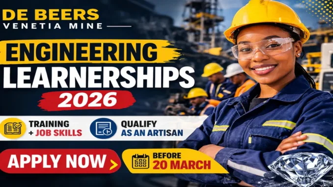 The De Beers Group has opened applications for the Venetia Engineering Learnership Programme 2026 at the Venetia Mine in Musina, Limpopo.